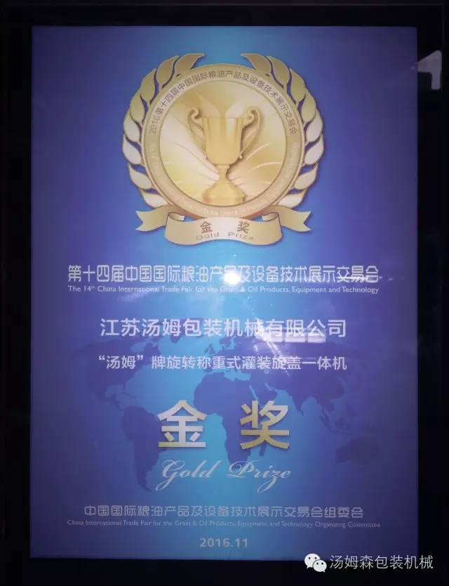 在11月6日閉幕的第十四屆中國(guó)國(guó)際糧油產(chǎn)品及設(shè)備技術(shù)展示交易會(huì)上,江蘇湯姆集團(tuán)“旋轉(zhuǎn)稱重式灌裝旋蓋一體機(jī)”喜獲金獎(jiǎng)。