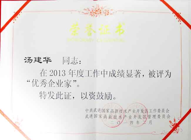 湯建華同志:在2013年度工作中成績顯著,被評為“優(yōu)秀企業(yè)家”